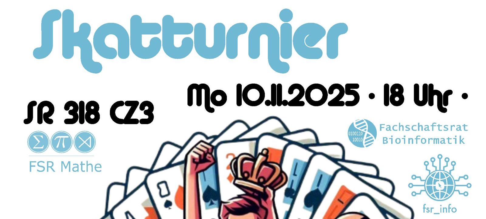 Liebe Skatspielende, Für kommenden Montag den 10.11.2025 möchte wir euch zum FMI Skatturnier einladen. Da am CIP noch etwas unklar ist, welche Thoska welche Tür öffnet, findet das ganze diesmal in der Carl-Zeiss-Straße 3,...