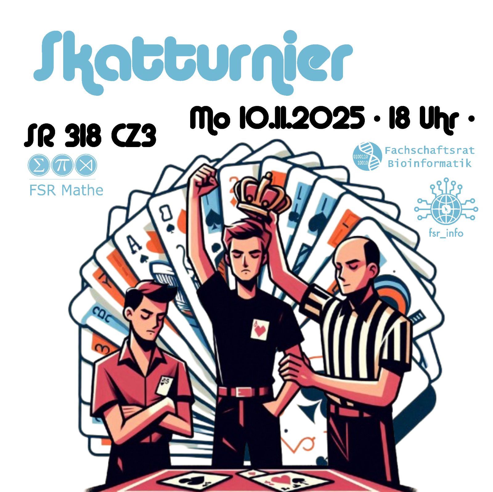 Für kommenden Montag den 10.11.2025 möchte wir euch zum FMI Skatturnier einladen. Da am CIP noch etwas unklar ist, welche Thoska welche Tür öffnet, findet das ganze diesmal in der Carl-Zeiss-Straße 3, im Seminarraum 318 statt. Bitte findet euch dazu bis spätesten 18:15 Uhr vor Ort ein, damit wir zeitnahe anfangen können. Mitbringen braucht ihr nichts, außer eurer guten Laune. Wir sind in Besitz von Altenburger Skatblättern und werden auch eine kleine Auswahl Snacks und Getränke stellen.