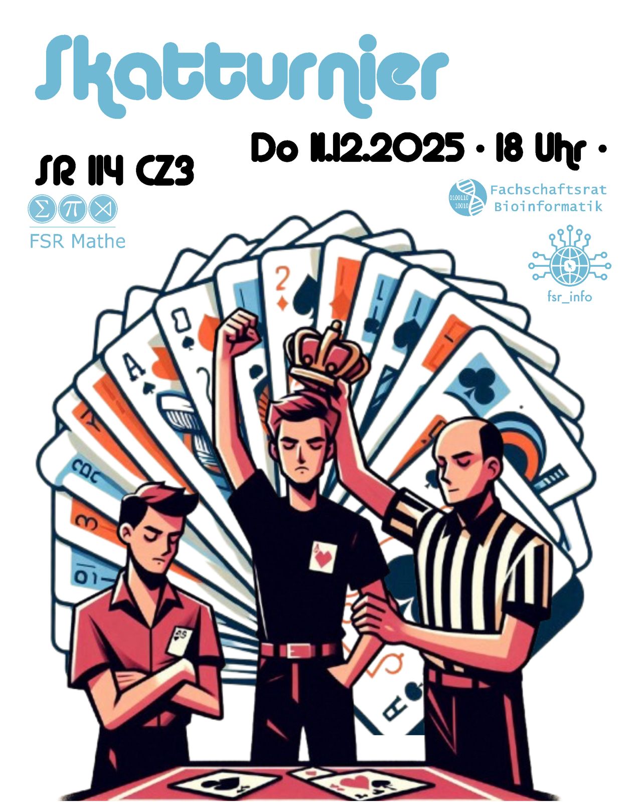 Für Donnerstag den 11.12.2025 möchte wir euch zum FMI Skatturnier einladen. Die Veranstaltung findet erneut in der Carl-Zeiss-Straße 3 statt, nicht am Campus Inselplatz.