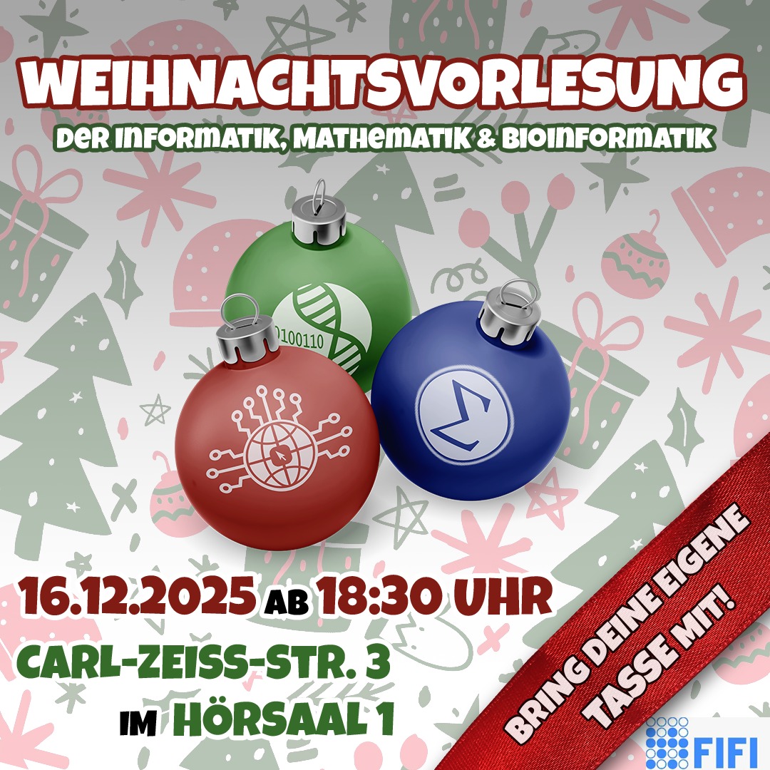 Der Dezember ist da und so wird es auch wieder Zeit für die traditionelle WEIHNACHTSVORLESUNG DER FACHSCHAFTSRäTE DER FMI! 🎄 Dieses Jahr findet diese am ▶️ 16. DEZEMBER (DIENSTAG) AB 19:00 UHR im Hörsaal 1 der Carl-Zeiss-Straße 3 statt, der Einlass beginnt um 18:30 Uhr.